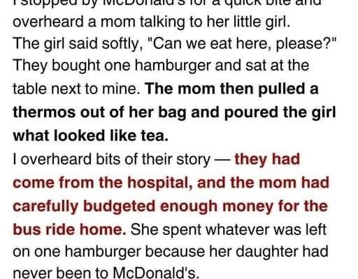 After a long, exhausting day, I stopped at McDonald’s hoping for something familiar and easy.   While waiting for my order, I noticed a mother and her young daughter step inside, hand in hand. Their clothes were worn but clean, and despite their modest appearance, the little girl’s excitement at the menu was unmistakable. When…