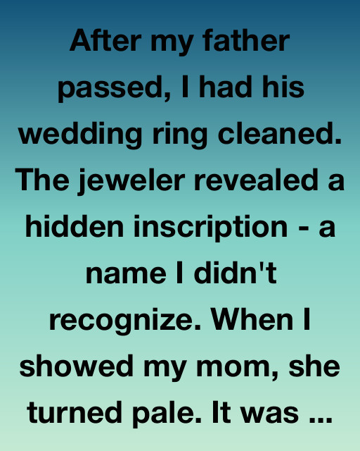 After my father passed, I had his wedding ring cleaned. The jeweler revealed a hidden inscription—a name I didn’t recognize. When I showed my mom, she turned pale. It was “Theresa.” She sat down heavily on the kitchen stool and didn’t speak for a full minute. Her hands trembled as she reached for a…