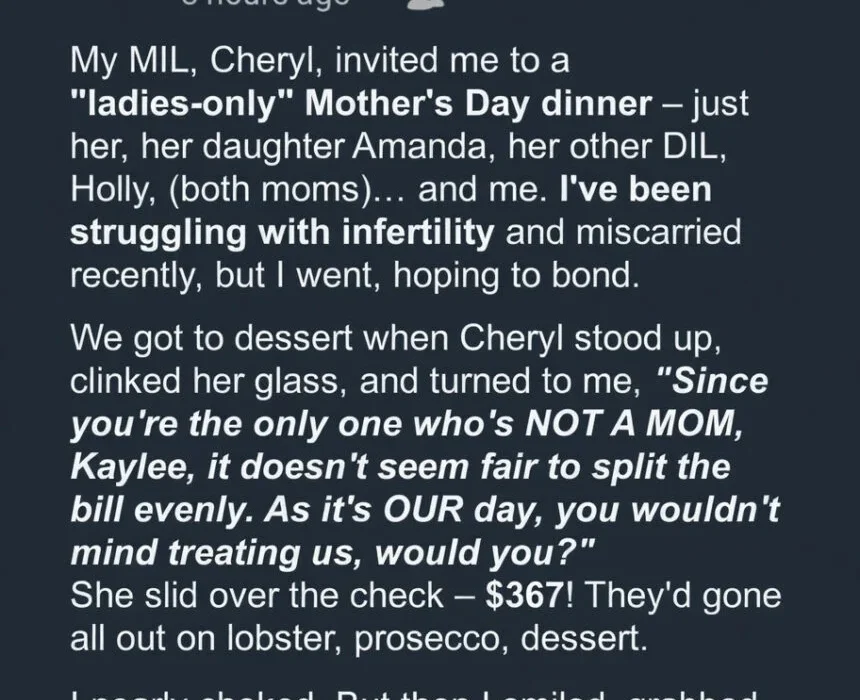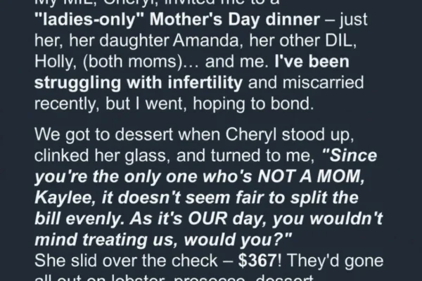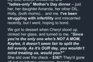 Kaylee had been through years of heartbreak trying to become a mom, so Mother’s Day was always painful for her.   This year, her mother-in-law, Cheryl, insisted on a “ladies-only” dinner with Kaylee and her sisters-in-law, both of whom had young children. Cheryl showered them with gifts, toasted to their motherhood, and excluded Kaylee from…