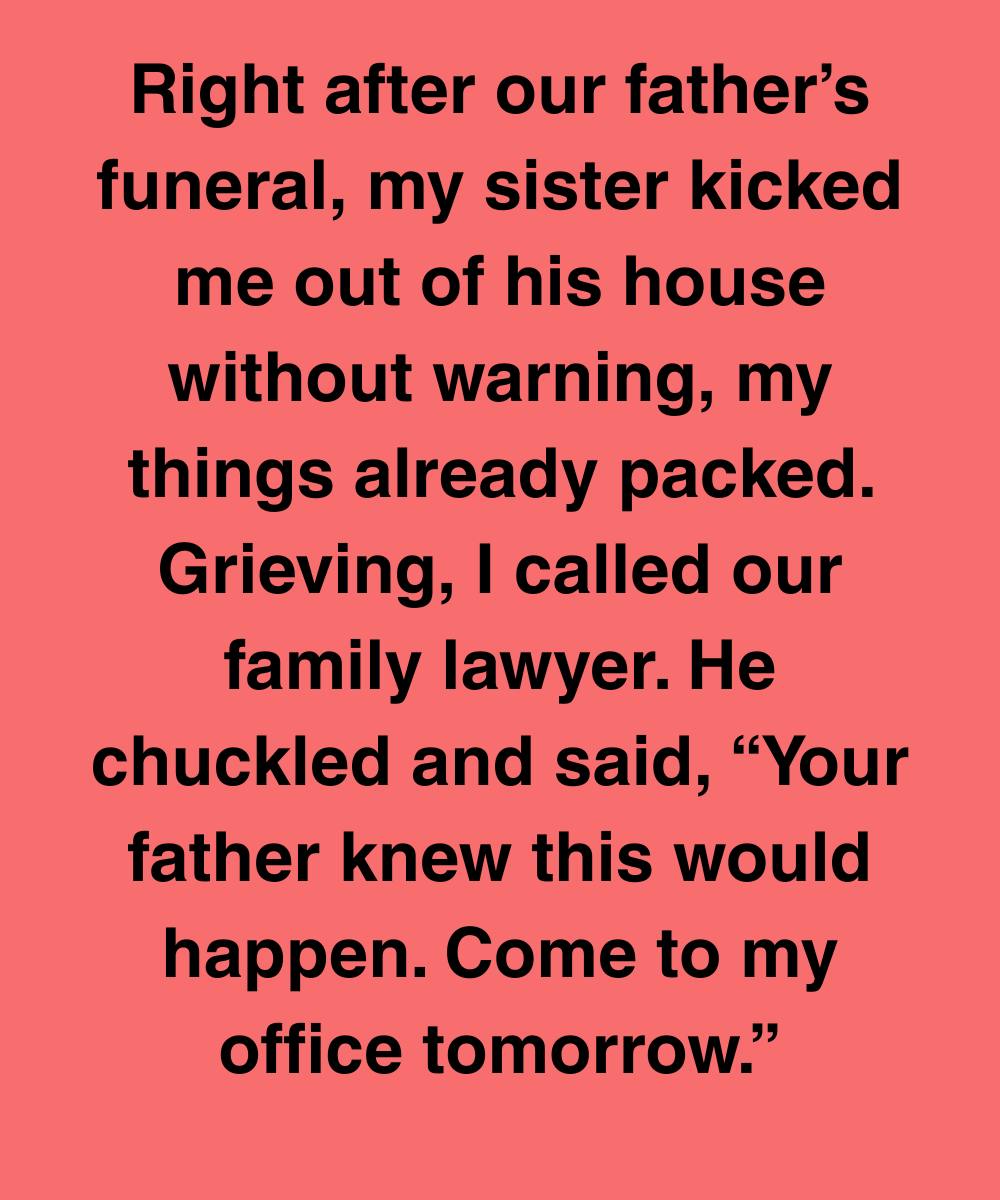 Grieving, I called our family lawyer. He chuckled and said, “Your father knew this would happen. Come to my office tomorrow.”
