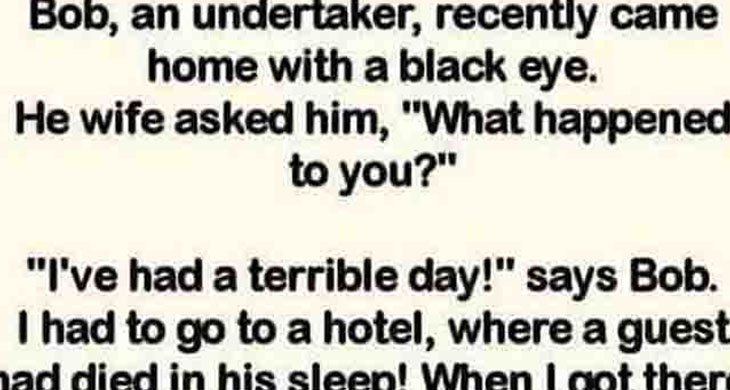 His wife asked him, “What happened to you?”“I’ve had a terrible day!” says Bob.“I had to go to a hotel, where a guest had died in his sleep! When I got there,