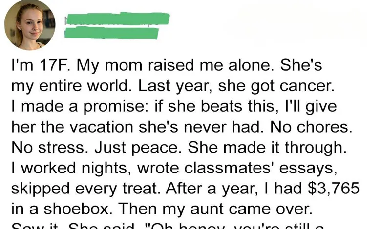 I’m Vera, 17. After my mom survived cancer, I promised myself I’d give her something she’d always dreamed of: a week at the ocean. So I worked double shifts, skipped every party, and spent nearly a year saving almost $4,000.