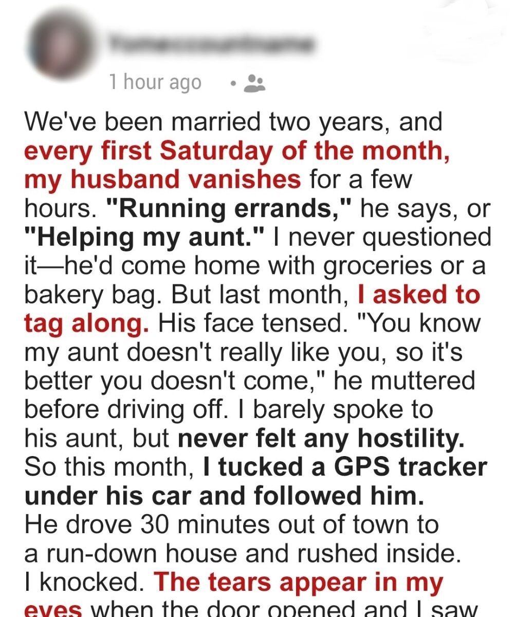 ” “helping my aunt”—always returning with bread, vegetables, little gifts. When he refused to let me come along and said his aunt “didn’t like me,” doubt took root. This month I slipped a GPS under his car and followed it to a run-down house.