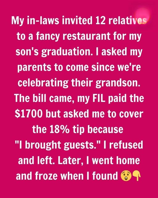 inviting twelve family members to celebrate. Wanting his own parents to share in the moment, Mark asked them to join as well. But instead of feeling welcome, they were treated as outsiders. When the $1,700 bill came, his father-in-law demanded that Mark cover the 18% tip “since he brought guests.” Hurt and offended, Mark refused—and tensions exploded.