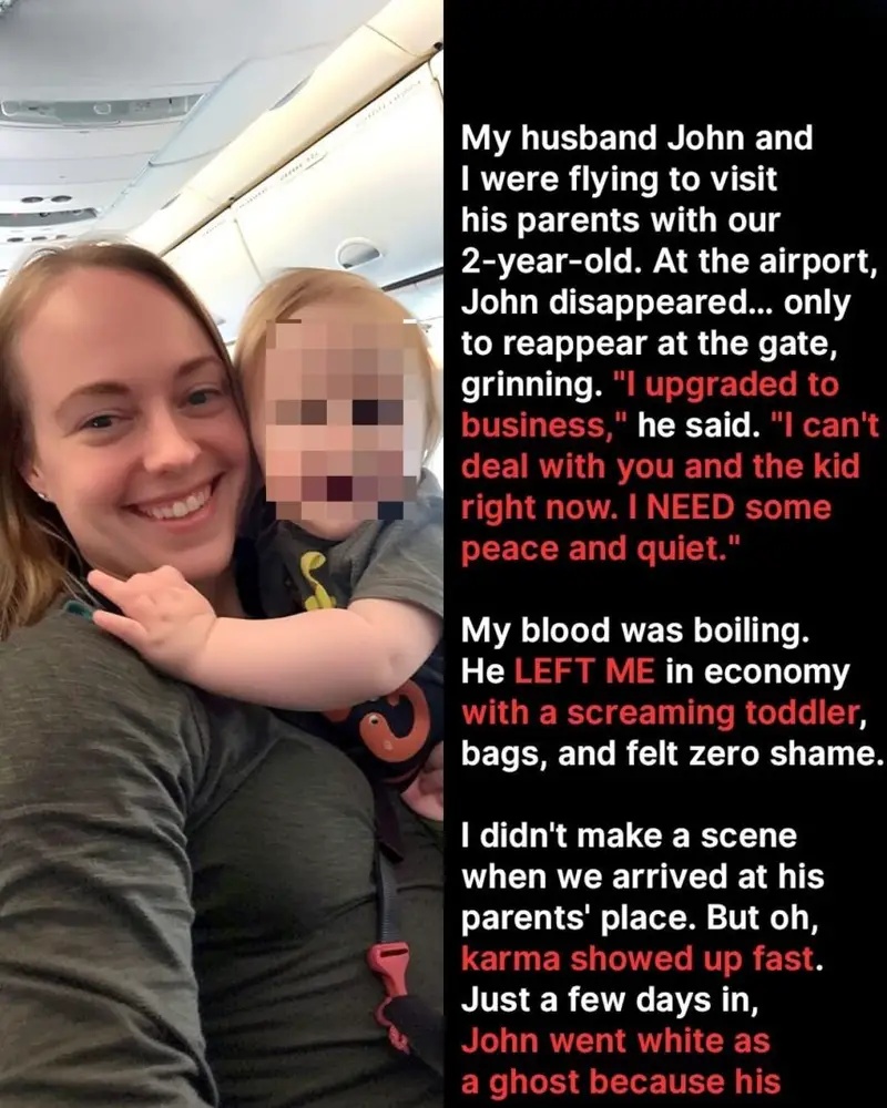 Claire was shocked when, during their flight to visit John’s parents, her husband abandoned her and their two-year-old son, Ethan, in economy class to enjoy business class alone.