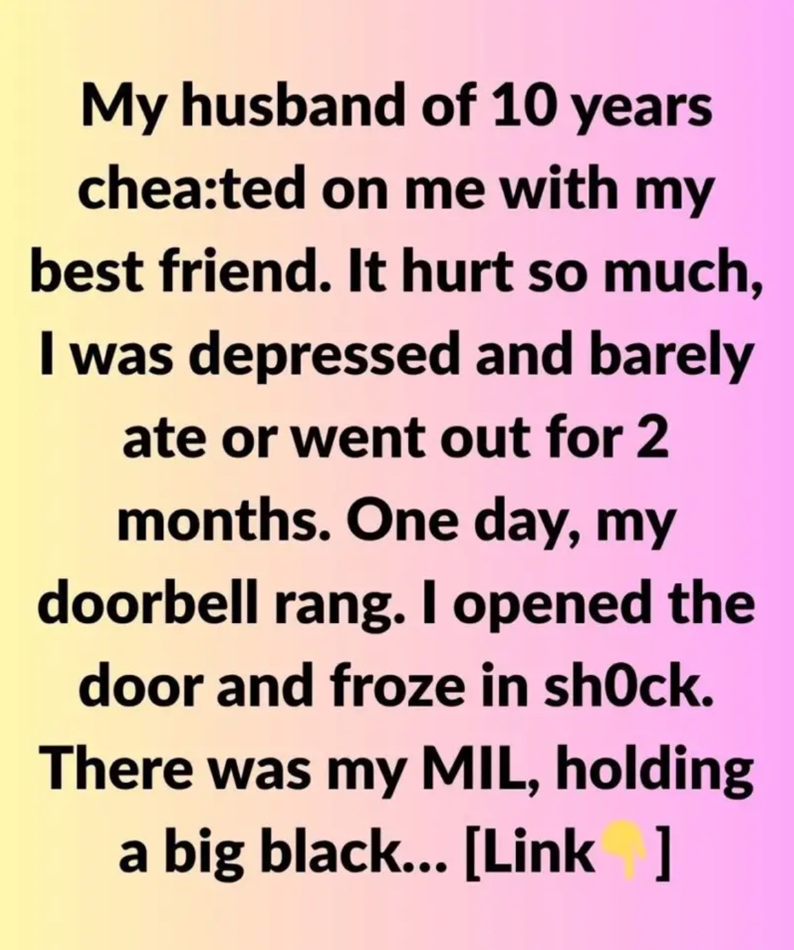 My husband of 10 years… cheated on me with my best friend. It hurt so much, I was depressed and barely ate or went out for 2 months. One day, my doorbell rang.