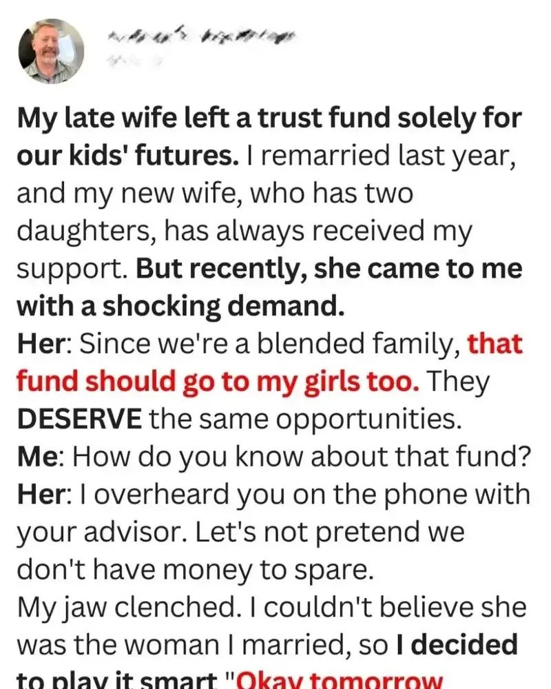 “We’ll create a fund for your daughters too, but it has to come from our joint income. Edith’s savings are not to be touched.”The next day, I made a loud call to my financial advisor so Gaby could hear:“