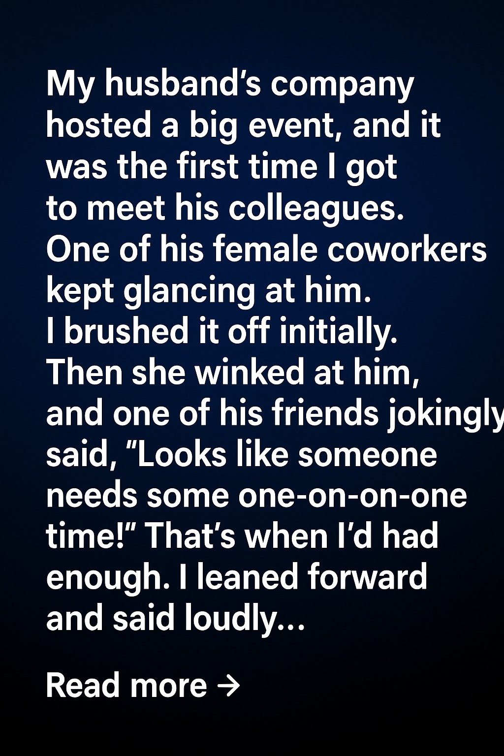 My husband’s company hosted a big event, and it was the first time I got to meet his colleagues. One of his female coworkers kept glancing at him. I brushed it off initially. Then she winked at him, and one of his friends jokingly said, “Looks like someone needs some one-on-one time!” That’s when I’d had enough. I leaned forward and said loudly, “Actually, he already has all the one-on-one time he needs—at home, with his wife.” The table went quiet for a moment, and then laughter broke out, easing the tension.