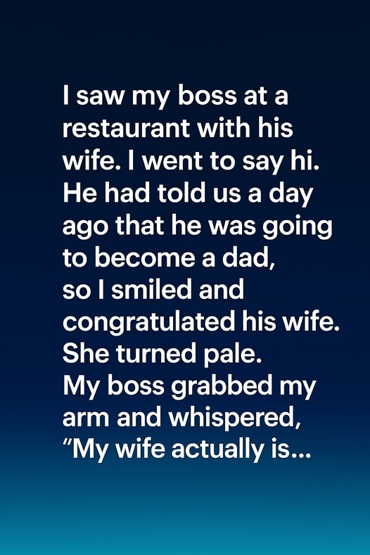 My boss, Michael, reached out and gripped my arm. His eyes darted between me and his wife, the tension in his jaw sharp and sudden. He leaned in and whispered, “My wife actually is…” I waited. The hum of conversation returned slowly, a soft wave returning after a storm. Michael’s hand tightened for a moment before he released me, and he cleared his throat.