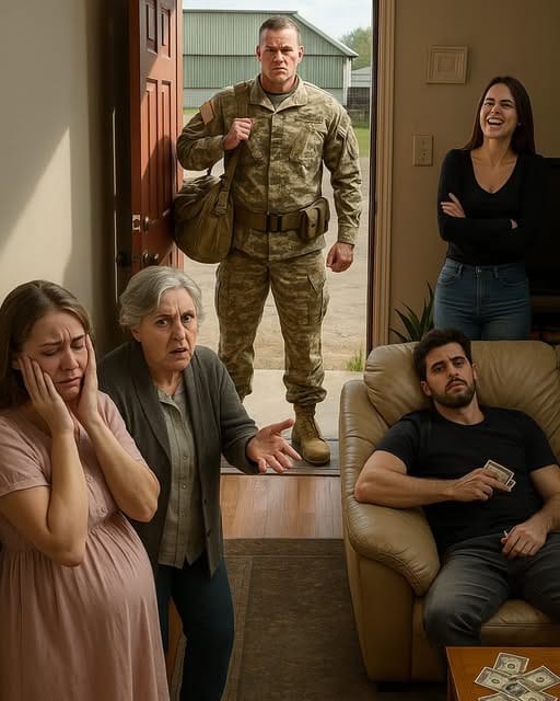 My husband stood in full uniform, duffel on his shoulder, cap tucked under one arm. For one breathtaking heartbeat, his face was pure joy—he’d come home early to surprise me. Then his gaze swept the room: his mother’s raised hand, Monica’s curled lip, Brett’s fist full of cash. The joy burned away.