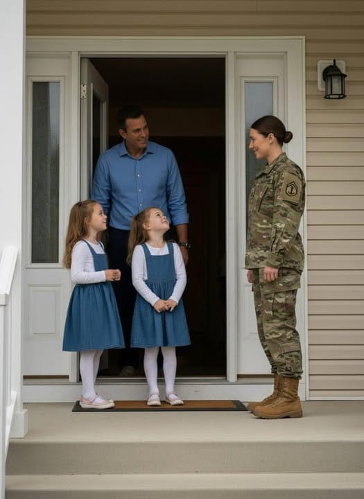 Months later, life found a new rhythm. Emily rented a small townhouse nearby. On weekends, the girls stayed over. They made pancakes, watched old Disney movies, and filled the walls with crayon drawings. One hung in a place of honor: a new picture of the three of them—Emily in uniform, the twins holding her hands.