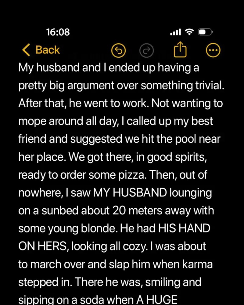 He left for “work” after snapping at me over breakfast, and I decided to spend the day at the pool with my best friend, May. The sun was bright, the pool crowded, and for the first time in weeks, I felt relaxed until I spotted him. There was Tom, lounging with a young blonde, her hand resting comfortably on his.