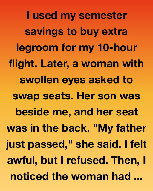 I used my semester savings to buy extra legroom for my 10-hour flight. Later, a woman with swollen eyes asked to swap seats.