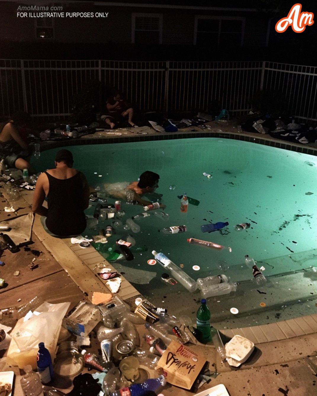 Our pool was full of trash. Empty beer bottles, plastic cups, even food scraps floated in the water. The Smiths’ guests were using our pool as a trash bin.