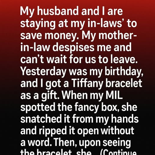 Yesterday was my birthday. My husband surprised me with a small blue box — a bracelet I’d once admired in passing but never expected to own. I was touched beyond words. But before I could even thank him properly, my mother-in-law noticed the box. Without asking, she took it right from my hands, pulled it open, and stared at the jewelry inside. The room went silent. I could see something flicker in her expression — not anger this time, but something else.