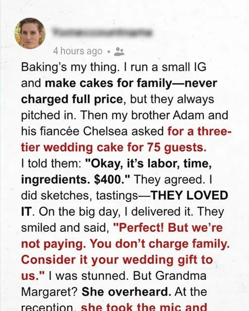 Baking’s my thing. I run a small IG page and make cakes for family—never charging full price, but they always chipped in. Then my brother Adam and his fiancée Chelsea asked for a three-tier wedding cake for 75 guests. I told them, “Okay, it’s labor, time, ingredients. $400.” They agreed. I spent weeks perfecting it—design sketches, tastings, every detail made with love. On the big day, I delivered it. They smiled and said, “Perfect! But we’re not paying. You don’t charge family. Consider it your wedding gift.”