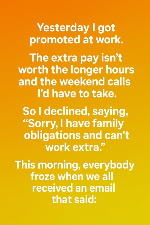 Yesterday I got promoted at work. The extra pay wasn’t worth the longer hours and the weekend calls I’d have to take. So I declined, saying, “Sorry, I have family obligations and can’t work extra.” This morning, everybody froze when we all received an email that said: “True leadership lies in choosing balance over burnout.” Beneath that sentence, my name stood alone. The office fell silent, not from anger, but from surprise and quiet respect.