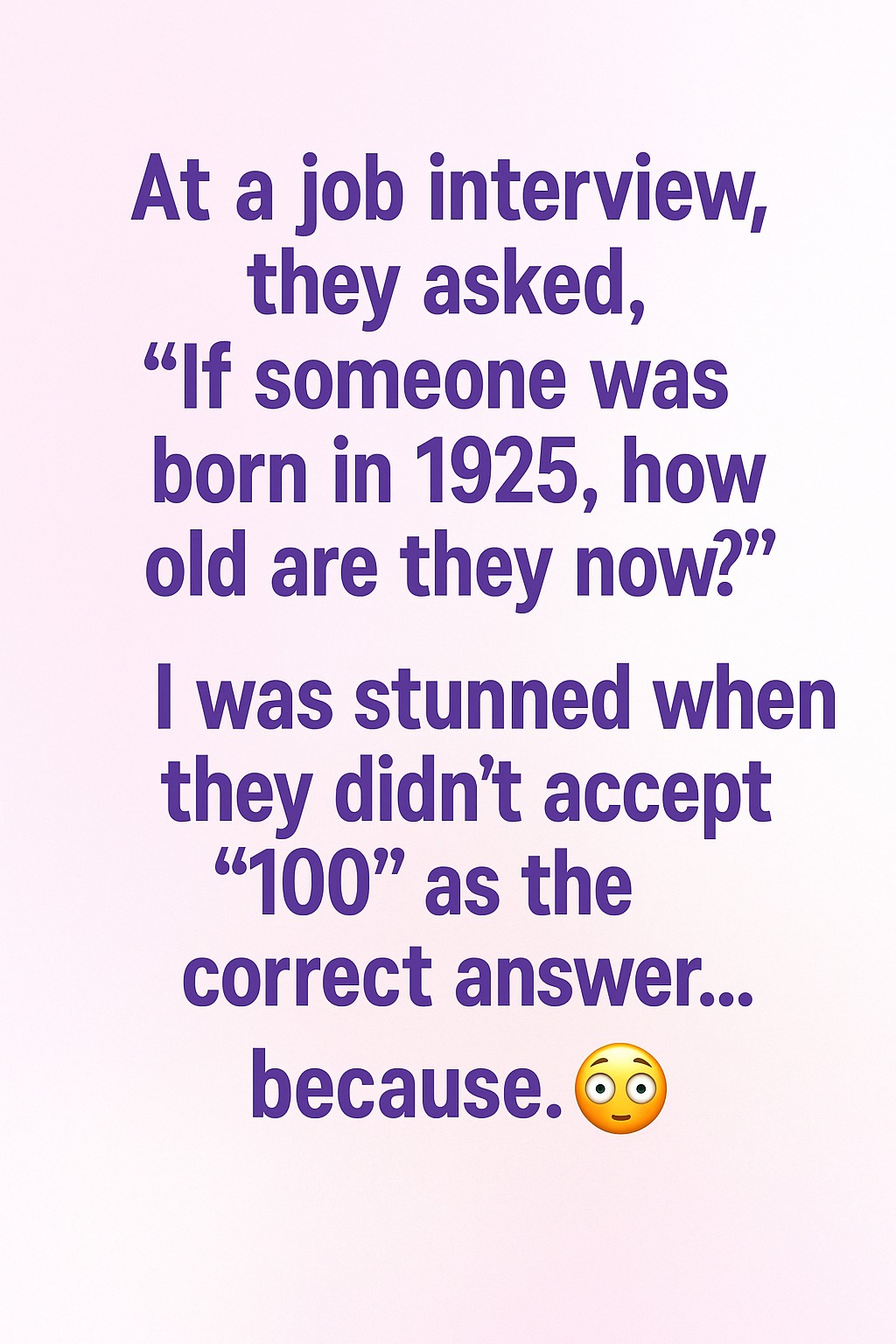 At a job interview, they asked, “If someone was born in 1925, how old are they now?” I was stunned when they didn’t accept “100” as the correct answer… because. the interviewer smiled and said gently, “They might not be alive anymore—but the real question is: how would you find the right answer if they were?” I realized then that they weren’t testing my math—they were testing my mindset. They wanted to see if I would assume facts or take the time to verify them. They were looking for someone who asks questions like, “Is the person still alive?” “When is their birthday?” “What’s the current year?” rather than jumping to a quick conclusion.