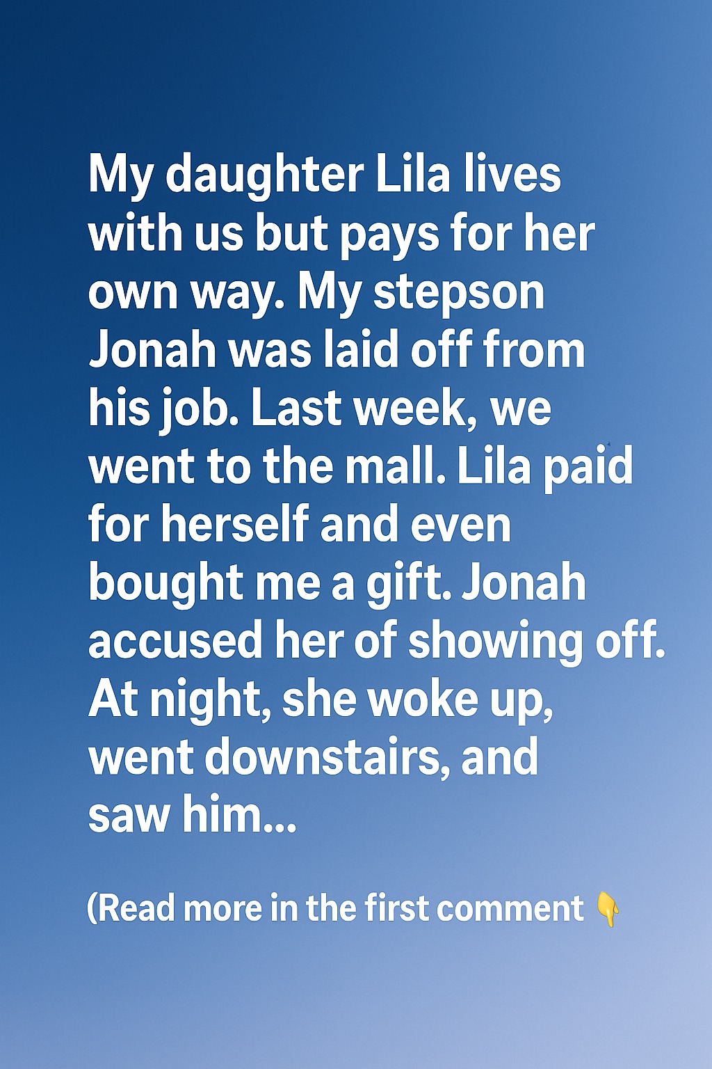 My daughter Lila lives with us but pays for her own way. My stepson Jonah was laid off from his job. Last week, we went to the mall. Lila paid for herself and even bought me a gift. Jonah accused her of showing off. At night, she woke up, went downstairs, and saw him…quietly sitting on the couch, staring at a stack of unpaid bills.