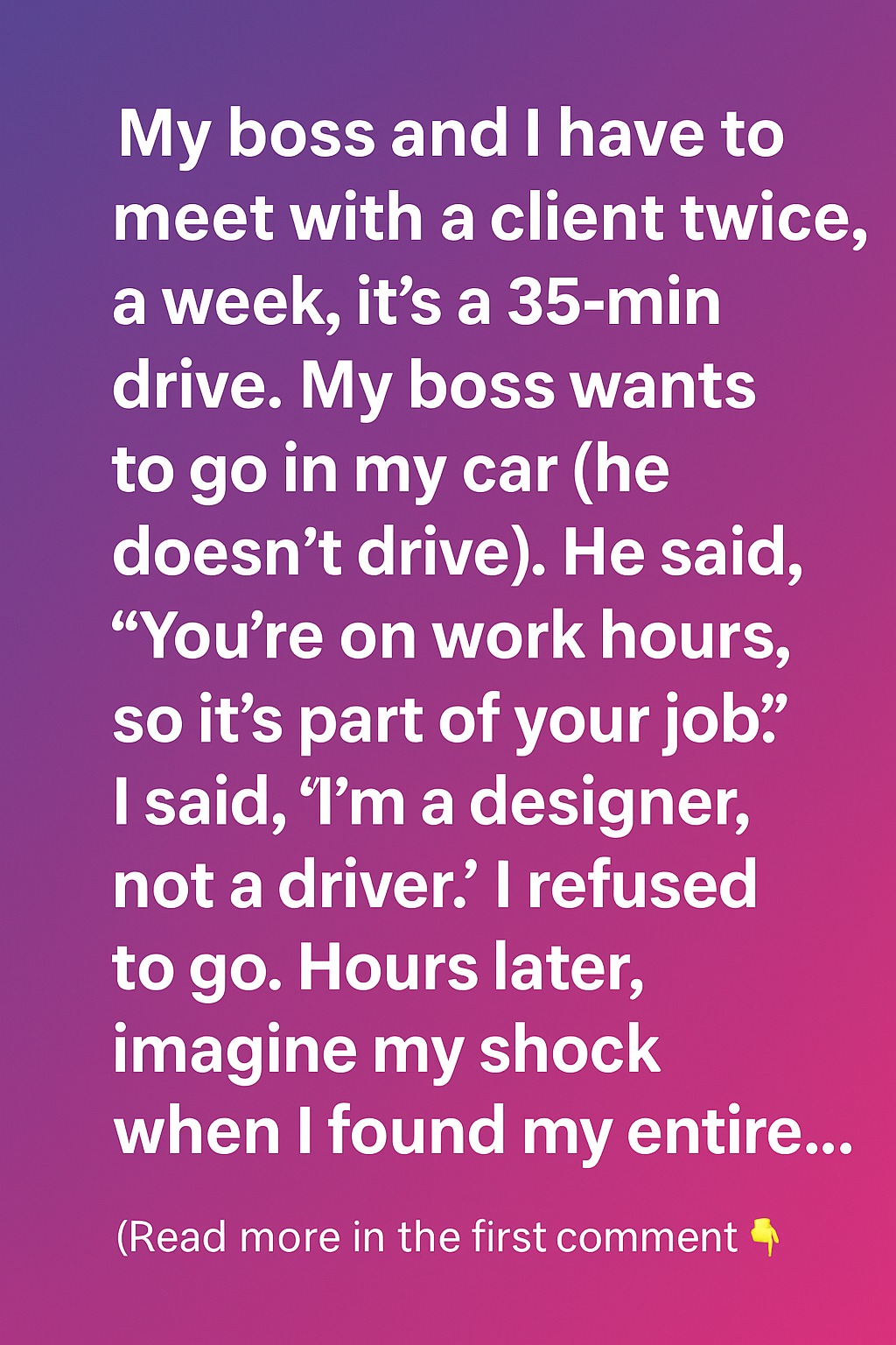 My boss and I were required to meet a client twice a week, a 35-minute drive away. Since he didn’t drive, he assumed I’d take him in my car, insisting it was “part of my job” because it was during work hours. I calmly explained, “I’m a designer, not a driver, and my car isn’t part of the company fleet.” He seemed annoyed when I refused, but I stood my ground. I didn’t think much of it—until later that day.