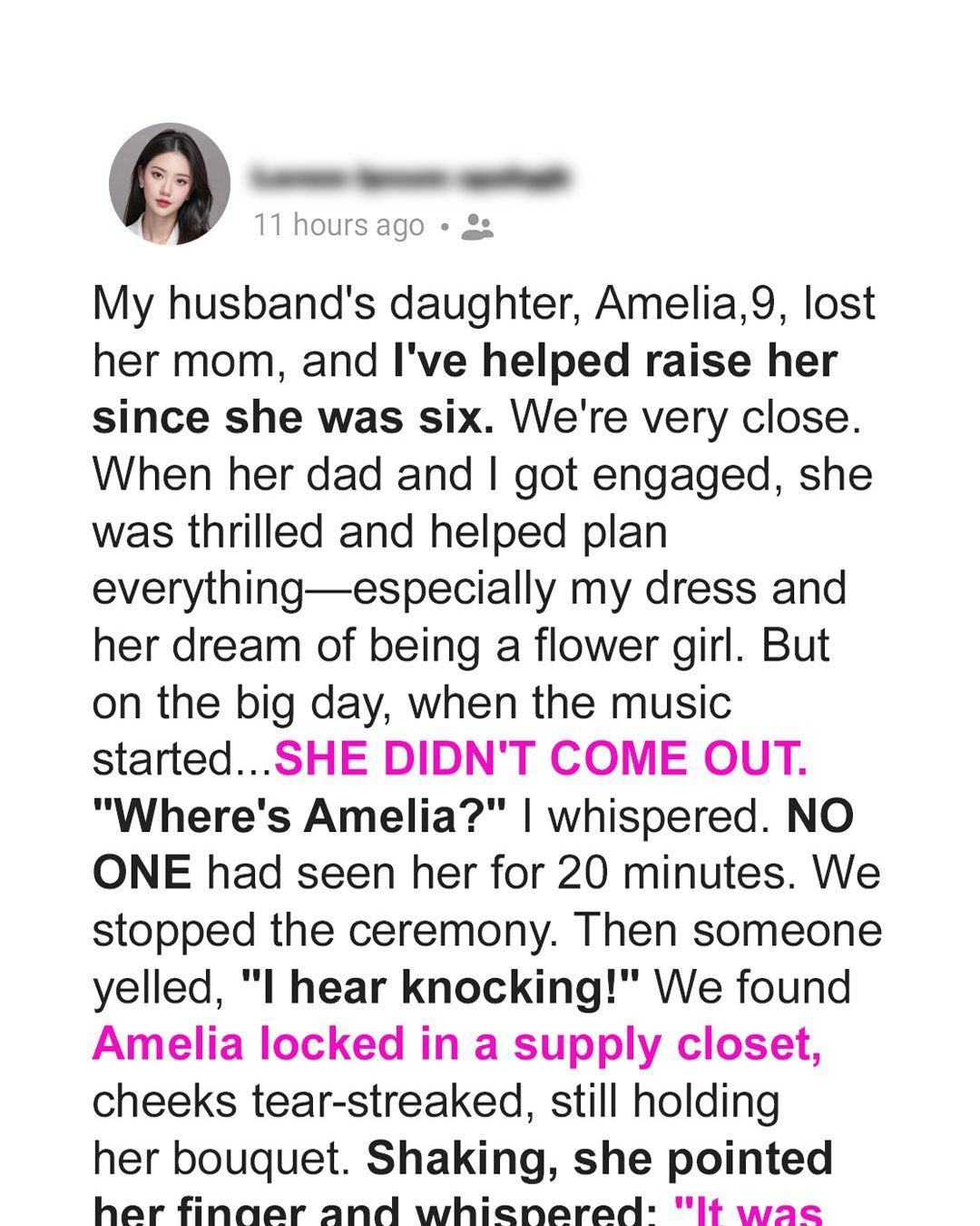Just as the music began, everyone turned to watch the flower girl — my stepdaughter, Amelia. But when her moment came, she was nowhere to be seen. The ceremony paused as we searched the venue, our hearts heavy with worry. Moments later, someone heard a faint sound coming from a nearby room. When we opened the door, there she was, holding her little flower basket, her eyes wide with confusion and tears.