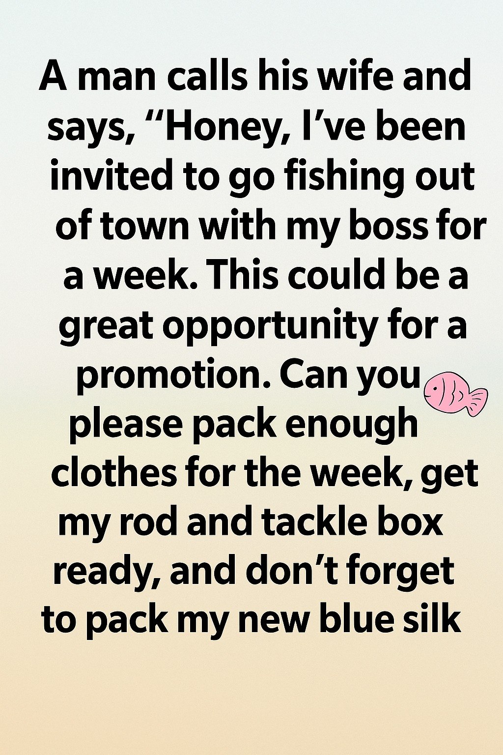 “Honey,” he said, “my boss invited me on a weeklong fishing trip out of town. It could be great for my career—maybe even lead to a promotion. Can you pack enough clothes for the week, get my fishing gear ready, and don’t forget my new blue silk pajamas.”