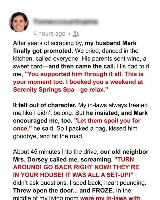My FIL Insisted I Go On a Spa Weekend He Paid For – Halfway There, My Neighbor Called Screaming, ‘It Was All Their Plan! Go Back Now!’