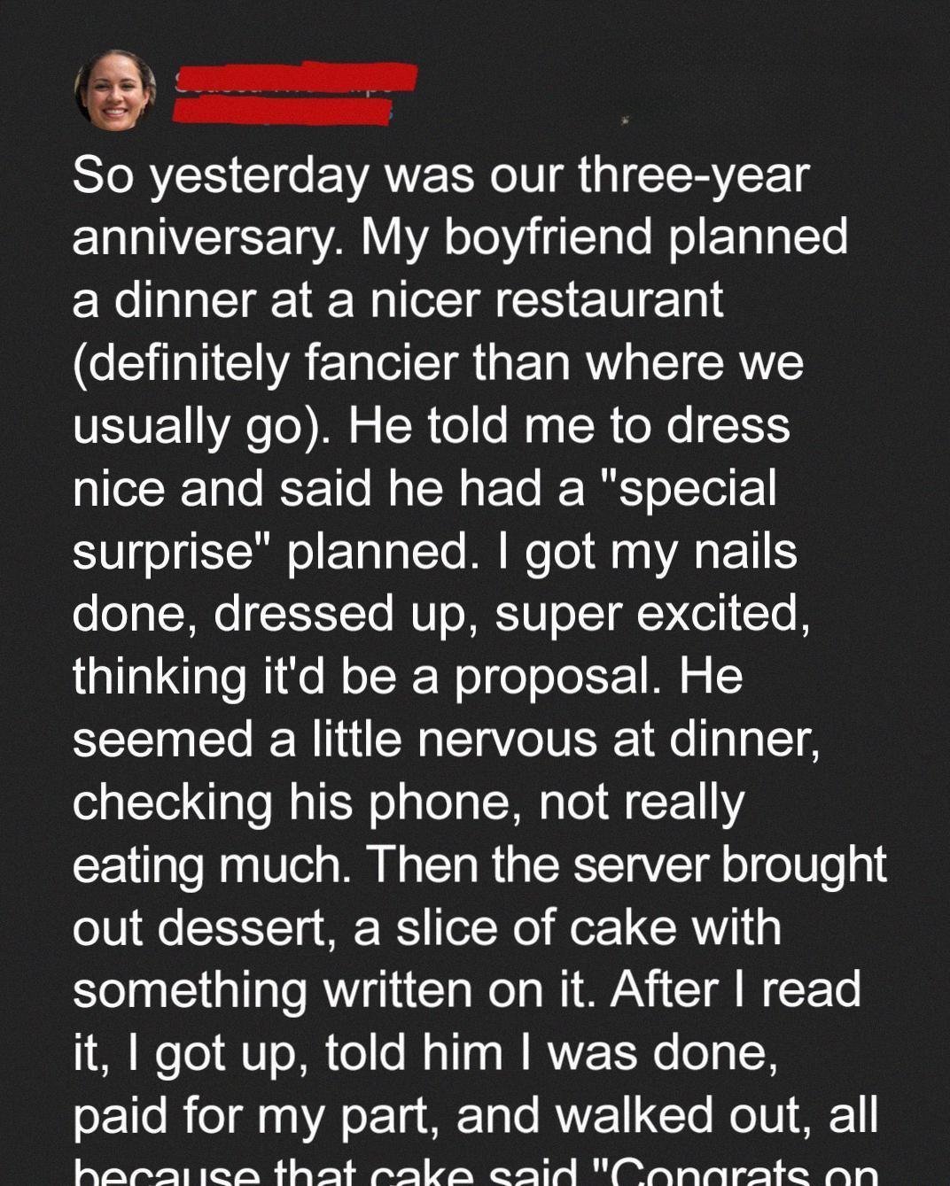 When dessert arrived, I leaned forward, expecting a ring box. Instead, the server placed a slice of cake in front of me. Written in pink icing were the words: “Congrats on Your Promotion!”
