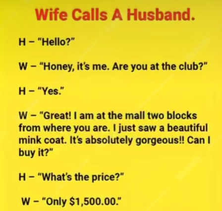 W: “Excellent! Two blocks away from you is the mall where I am now. I just noticed this stunning mink coat. It’s really very beautiful! Is it available for purchase?