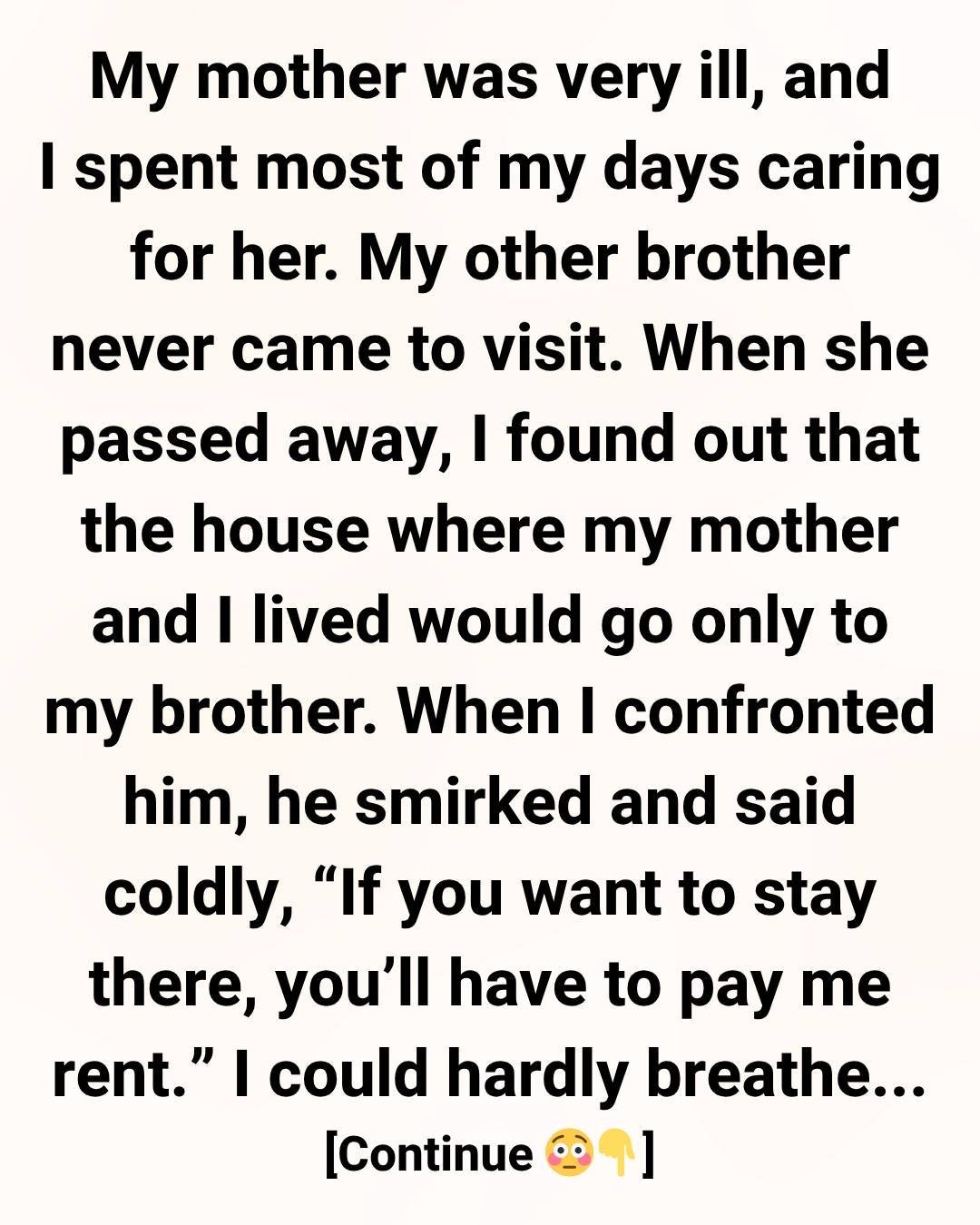 For my own home? For the house where I spent sleepless nights taking care of our mother? I felt betrayed—by him, and in some ways, by her too.