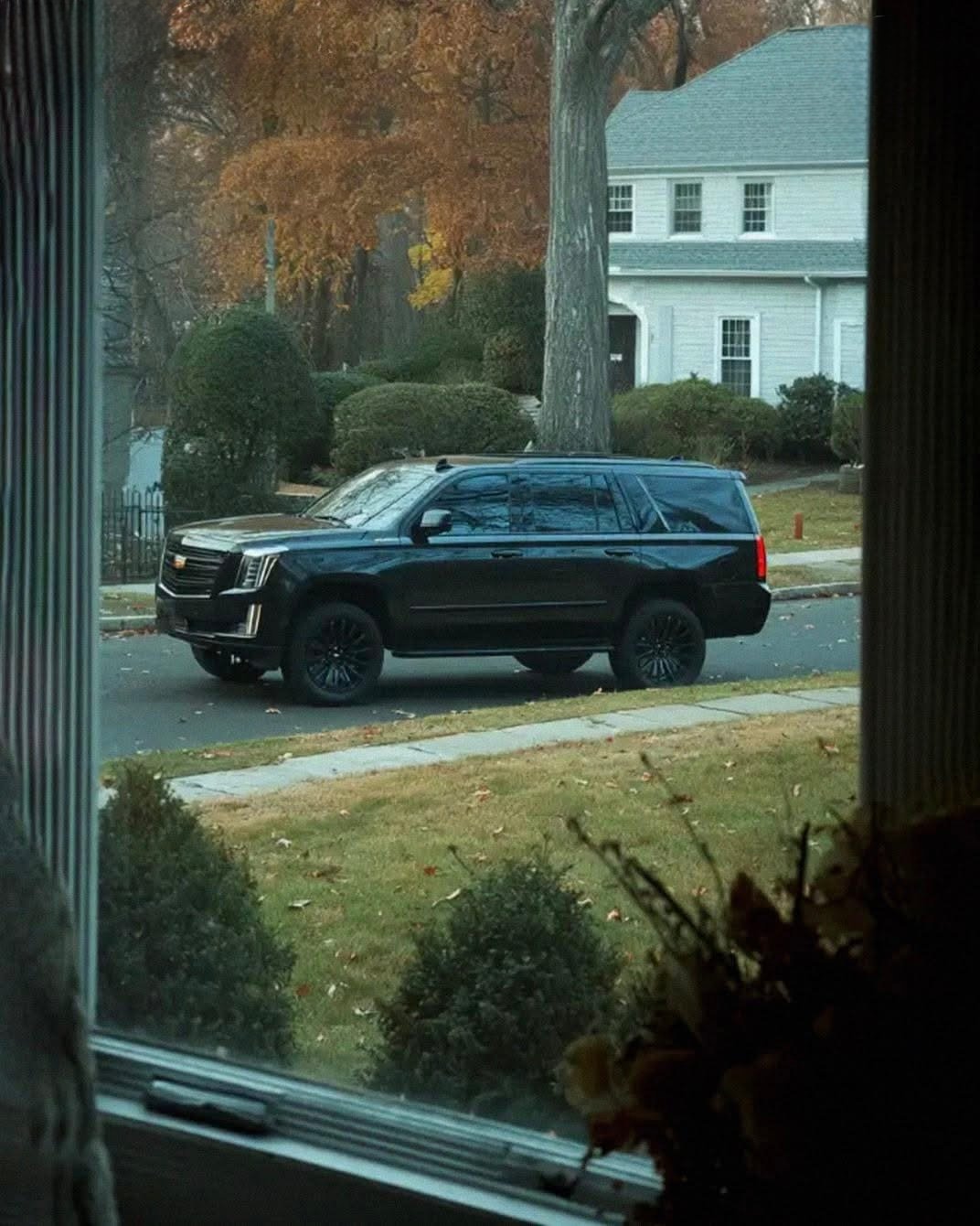 A black SUV. Big, expensive-looking, parked directly across the street.