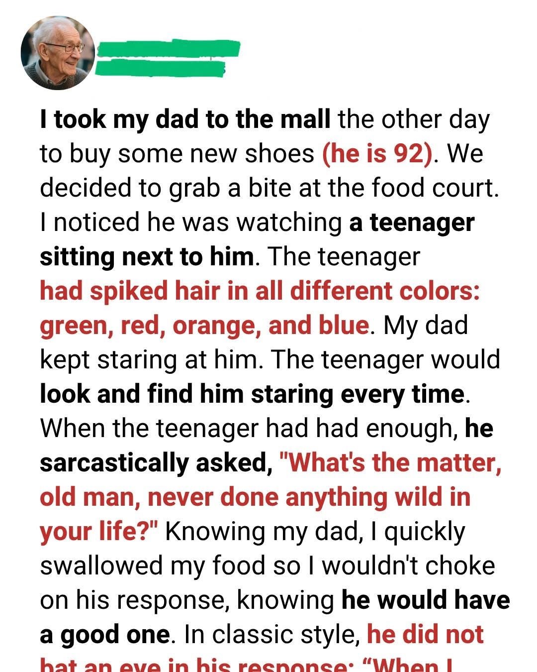 Dad calmly set his fork down, offered a gentle smile, and then replied — and his words were so unexpected that even the boy leaned in a little. “When I was young,” Dad said, “I didn’t have colorful hair, but I tried to make the world around me brighter through kindness, respect, and joy.”