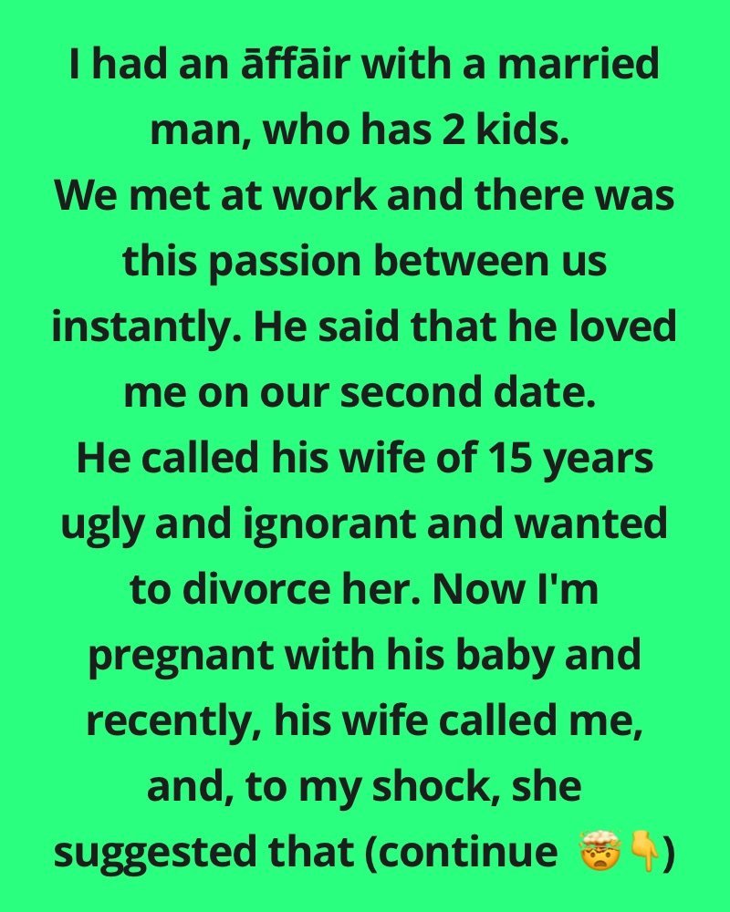 “Now I’m pregnant with our baby. Last night, Kevin’s wife called me and, to my shock, she knew everything about me: my name, my age, she knew where I lived, and she knew I was 4 months pregnant with her husband’s baby.