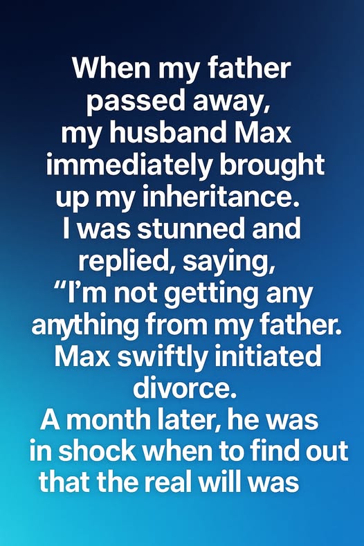 Max, blindsided me. Just days after the funeral, he asked whether my father had left me an inheritance—no sympathy, no softness. When I told him there wasn’t much, something cold flickered in his eyes. Instead of comforting me, he grew distant, silent, almost calculating.