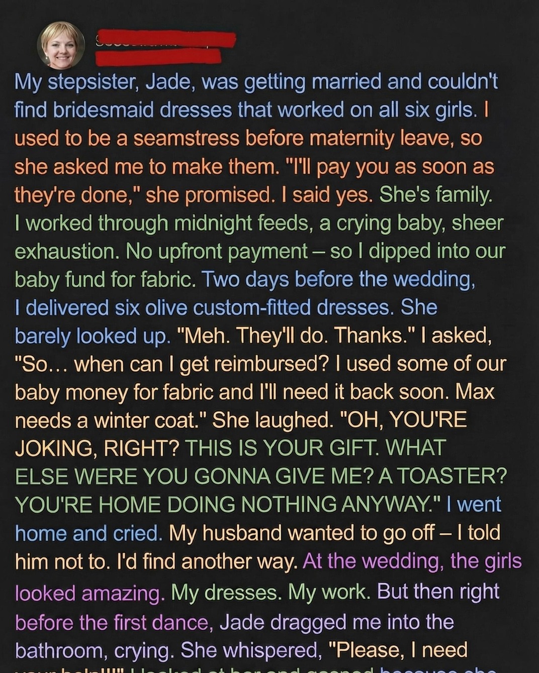 I hesitated but agreed, hoping the project might bring us closer. With a newborn at home and our savings stretched thin, the extra income would have helped. Still, I used $400 from our baby fund to purchase fabric, lining, and all the materials needed. Over the next three weeks, I cared for my son in between fittings, adjusted designs to suit each bridesmaid’s needs, and worked late into the night. By the time the dresses were finished, they looked like they belonged in a professional showroom. When I delivered them, however, Jade brushed off my effort and insisted the dresses were simply my “gift,” despite promising to pay for both materials and labor. Her casual dismissal left me feeling unappreciated and deeply disappointed.