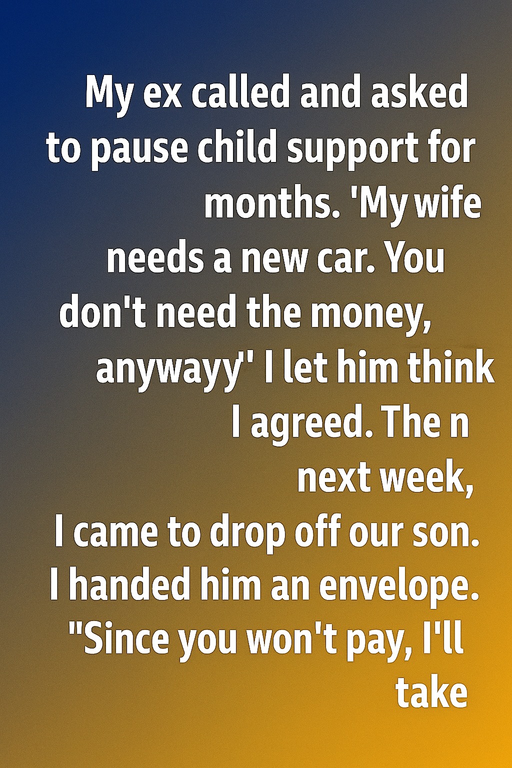 You don’t need the money, anyway,” I let him think I agreed.The next week, when I came to drop off our son, I handed him an envelope. “Since you won’t pay, I’ll take responsibility in a different way,” I said calmly. Inside wasn’t a bill or a demand—just a neatly typed letter outlining the updated parenting schedule I intended to file with the court.