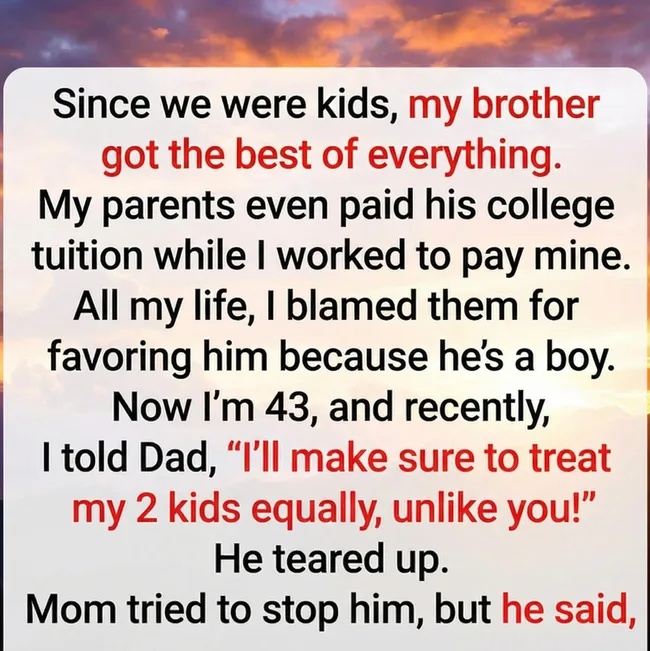 As adulthood arrived, the distance between us grew quieter but no less real. My brother moved easily into stability, while I built my life brick by brick—career, marriage, and eventually two children. I promised myself that my kids would never feel measured against each other the way I had. I worked hard to provide balance, fairness, and honesty in my home. Still, old wounds have a way of resurfacing. At 43, during what was meant to be a simple family visit, decades of buried feelings finally spilled out. In a moment of frustration, I told my father I would raise my children differently, making sure they were treated equally—unlike how I felt growing up.