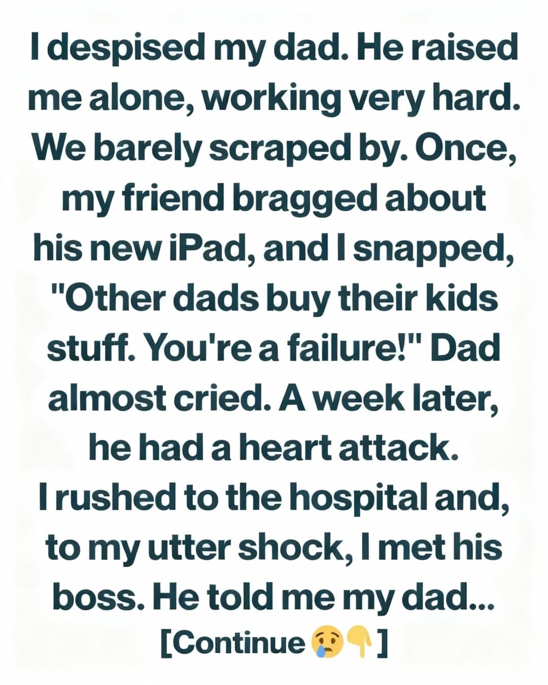 A week later, everything changed. My dad suffered a heart attack, and I rushed to the hospital terrified, replaying my cruel words over and over in my head. While waiting in the hallway, a man approached me and introduced himself as my father’s boss. He didn’t know who I was at first, but when he realized I was his son, his expression softened. He told me things about my dad that I had never known—how he was the first to arrive and the last to leave, how he often took extra shifts no one else wanted, and how he had turned down better-paying opportunities because they required moving farther away or working hours that would leave me alone too much. Listening to him felt like having a veil lifted from my eyes.