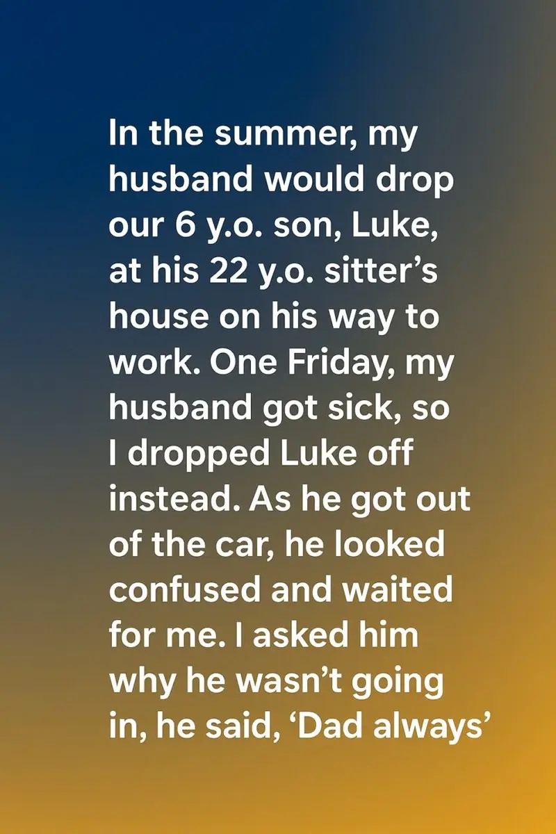 up to the babysitter’s house, I smiled and encouraged him to hop out of the car like usual. But instead of running to the door with his usual excitement, Luke just stood there, looking puzzled.“Why aren’t you going in, sweetheart?” I asked gently.He turned to me with a confused expression and said, “Dad always goes inside with me first.”His words caught me off guard. At that moment, I realized that sometimes, in the rush of daily routines, small moments can hold big meanings. My husband hadn’t just been dropping Luke off—he had been taking the extra time to walk him in, making sure he felt safe and cared for.