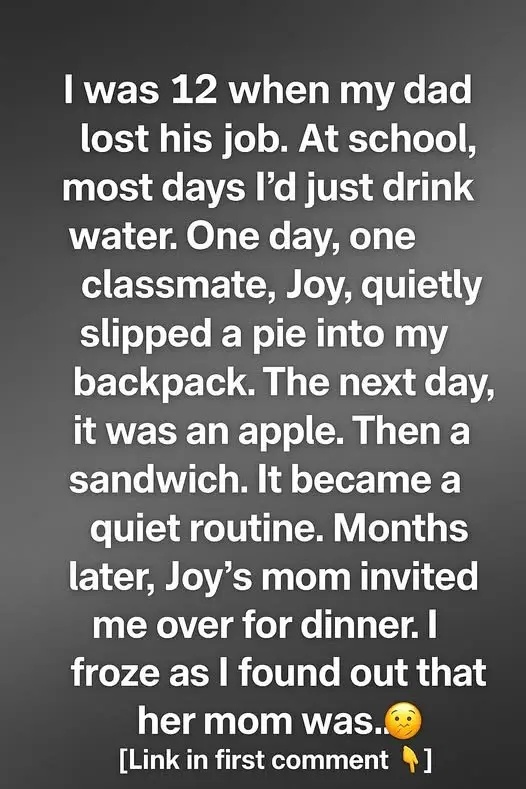 It was embarrassing, but I didn’t want anyone to know how tough things were at home.One afternoon, I unzipped my backpack and froze. Inside was a small pie, still warm.