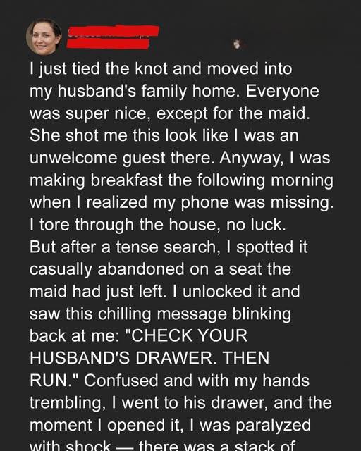 The house was stunning, and despite a chilly welcome from the maid, Valerie, I was determined to make it work. One morning, while preparing breakfast, Valerie gave me a cold warning to hurry up and serve the family. When I reached for my phone, it was missing — and the message I found on the screen shook me to my core: “Check your husband’s drawer. The top left one. Then RUN!”