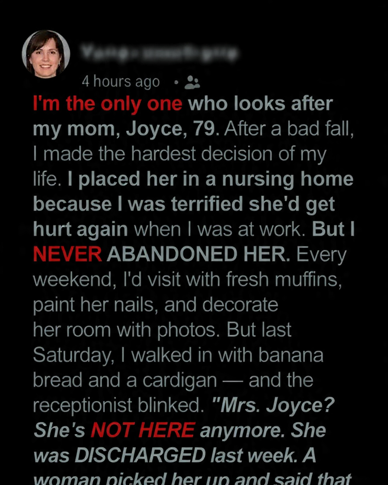 But I NEVER ABANDONED HER. Every weekend, I’d visit with fresh muffins, paint her nails, and decorate her room with photos. But last Saturday, I walked in with banana bread and a cardigan—and the receptionist blinked.