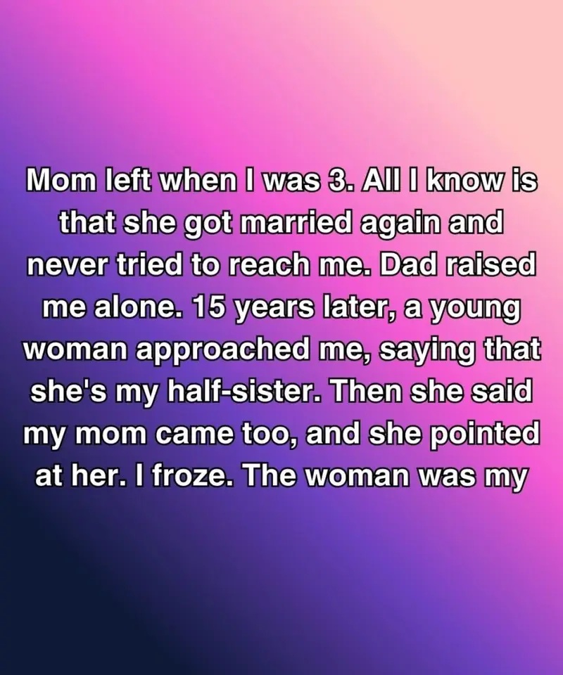 Fifteen years later, a young woman approached me, saying that she’s my half-sister. Then she said my mom came too, and she pointed at her. I froze.