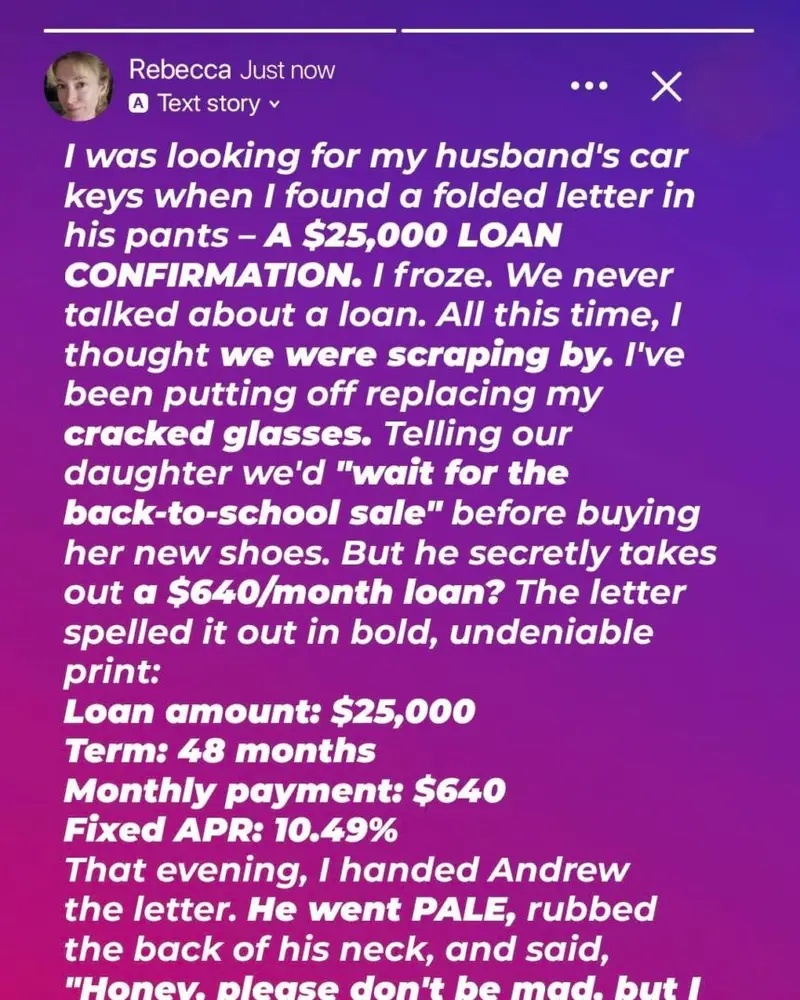 Every financial decision had been mutual—until now. Andrew never mentioned a loan, and she had no idea what the money was for. When she confronted Andrew, he claimed it was a surprise—he had bought a used SUV for the family.