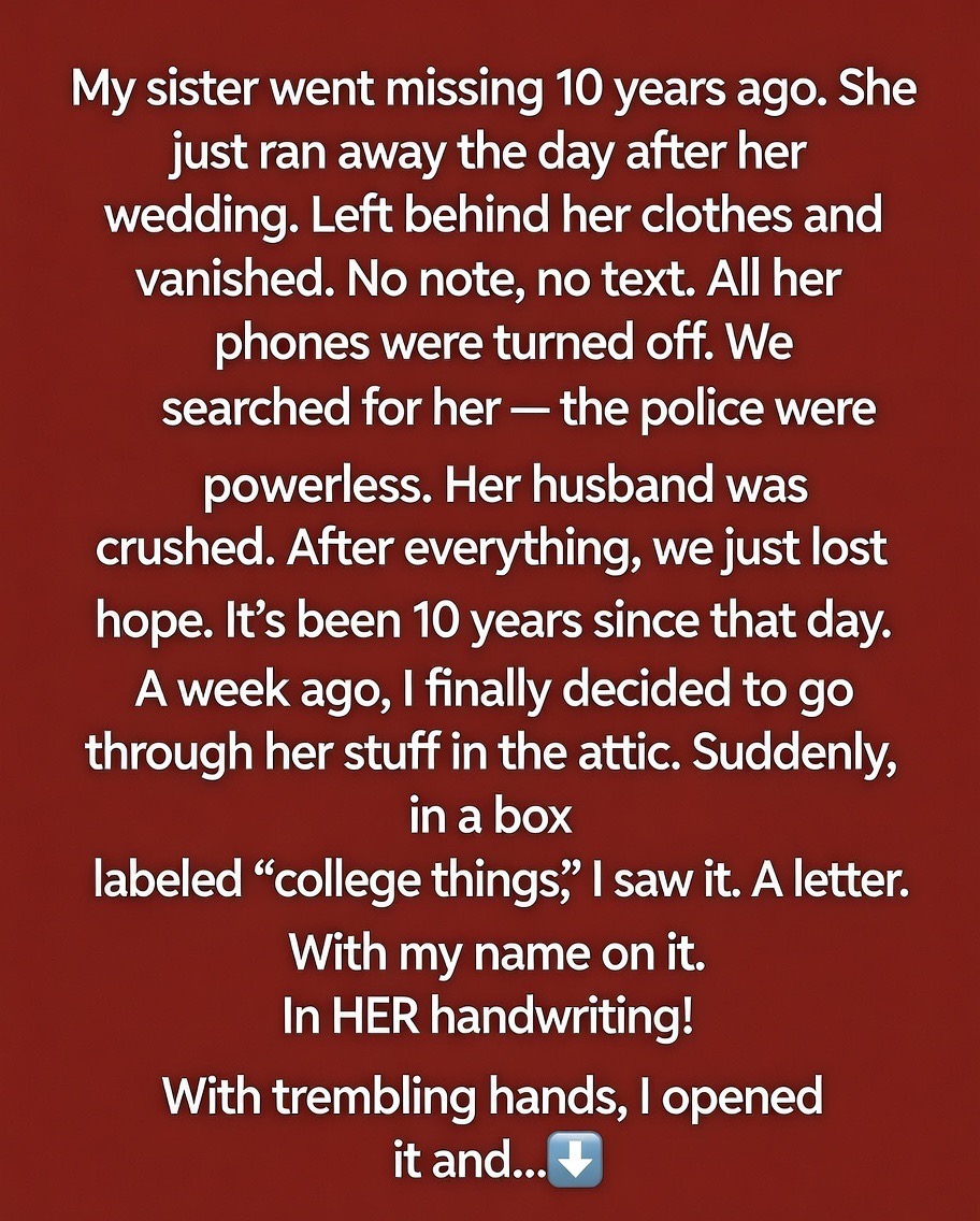 My sister went missing 10 years ago. She just ran away the day after her wedding. Left behind her clothes and vanished.