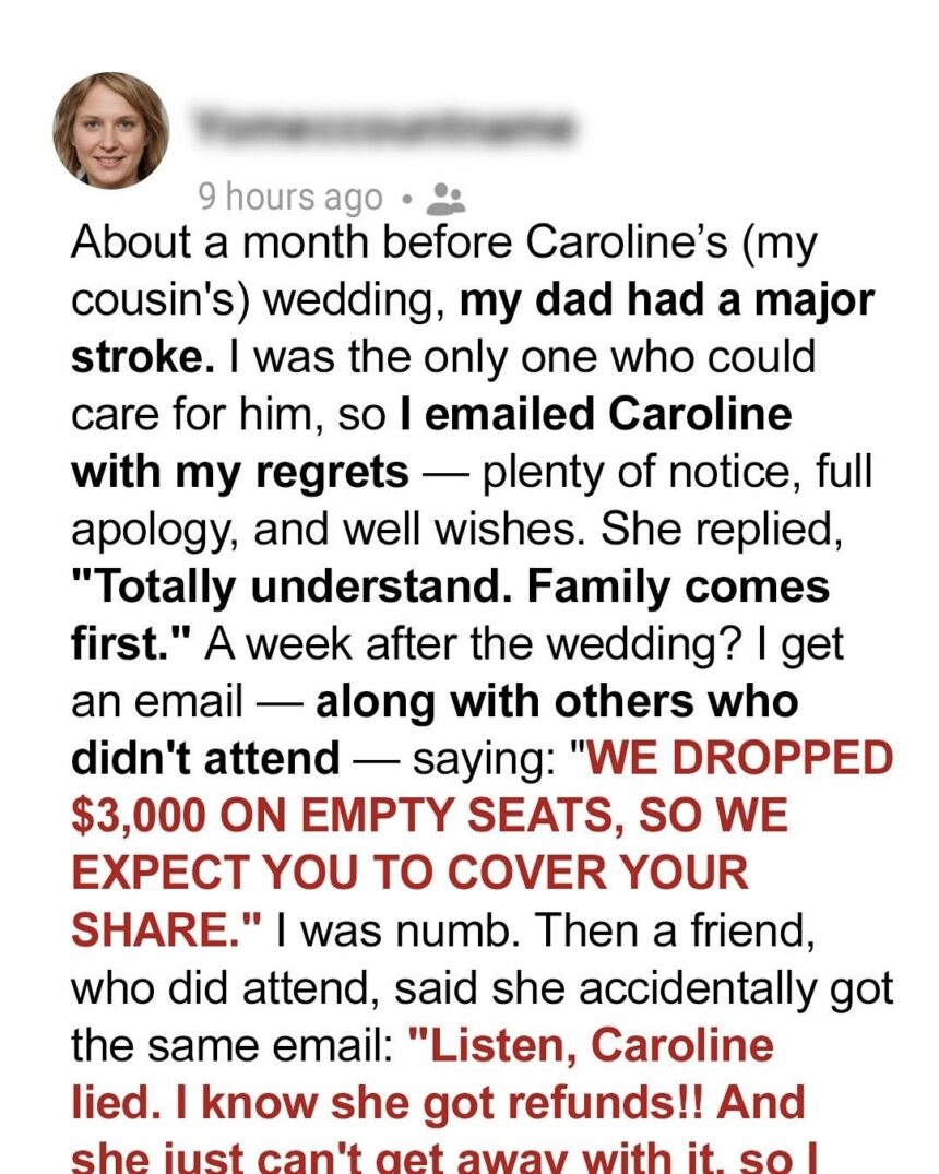 My cousin Caroline insisted she understood when I missed her wedding due to my dad’s stroke. I thought she did—until a week after the wedding, when I received a mass email demanding I pay for my “empty seat.”