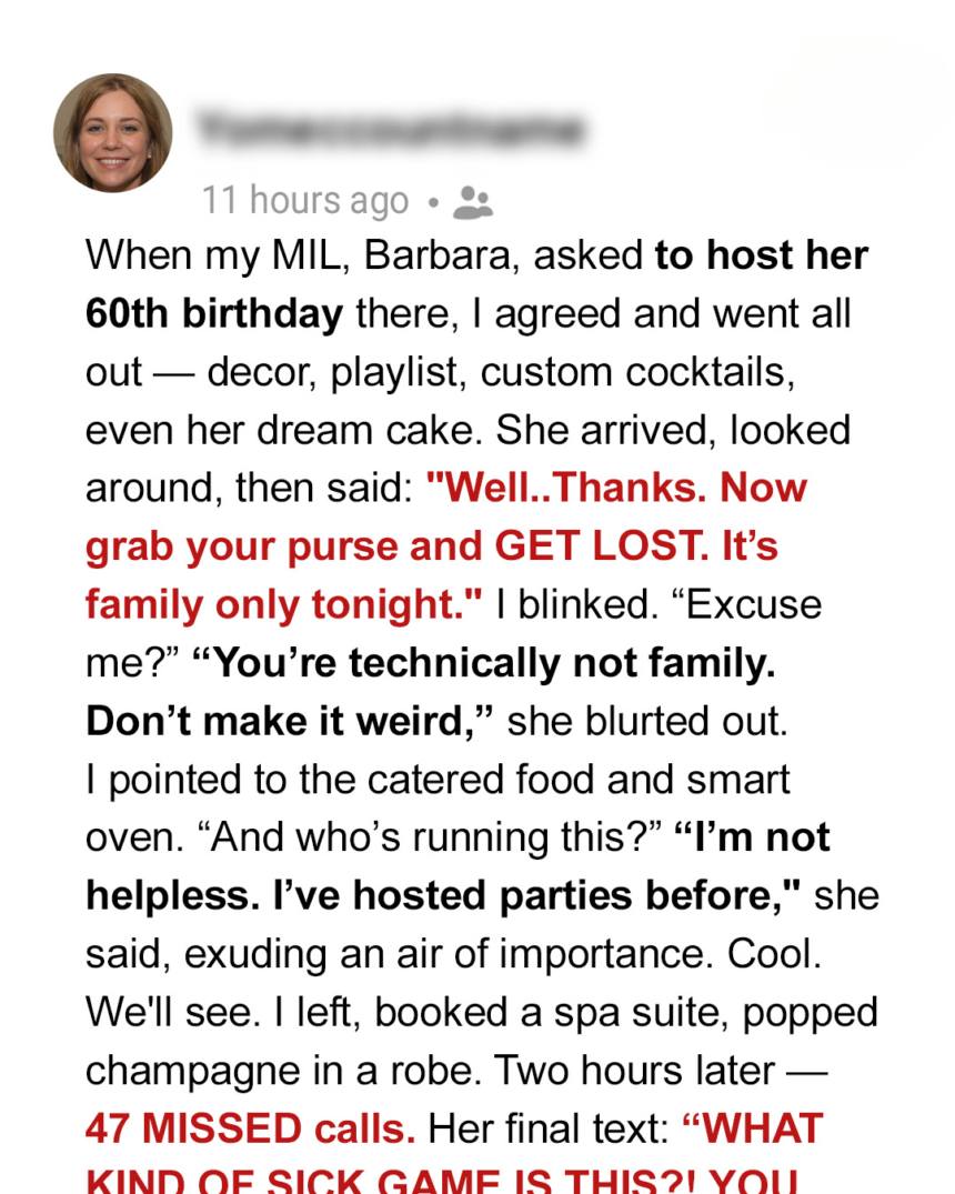 She’s excluded me from family photos and treated me like an outsider. Still, for his sake, I threw her a lavish 60th birthday party, sparing no expense on decorations, catering, and even a designer handbag she’d been eyeing.