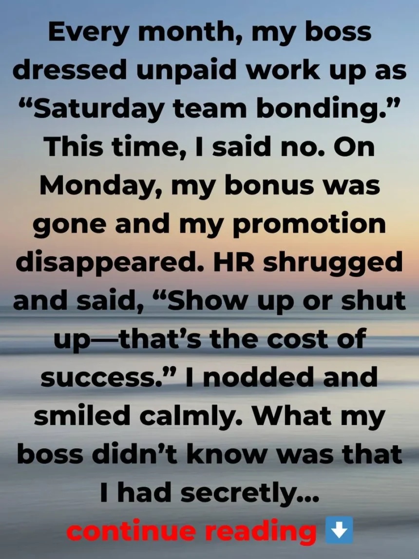 For the last year, my boss has been disguising mandatory unpaid work as “Saturday bonding.” It was always the same: “quick” client calls or “casual” deadlines that stole my entire weekend. This time, I finally said no. I had family plans and refused to log on.