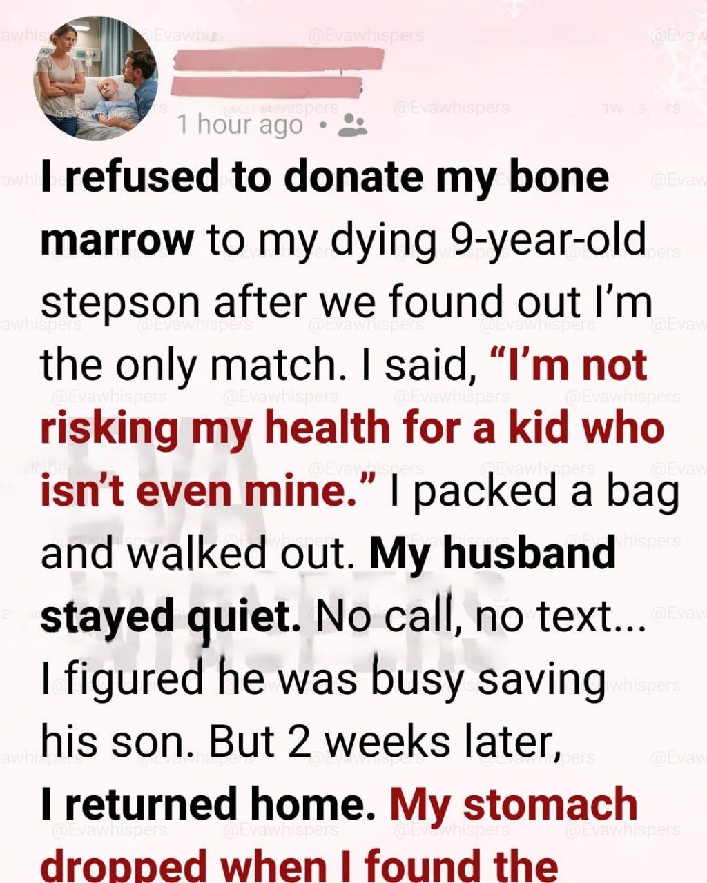 I said no to saving a nine-year-old boy’s life. He wasn’t a stranger, and he wasn’t a distant relative; he was my stepson. For three years, Leo had been a permanent fixture in my world. He was the child who ate breakfast at my table, left his muddy sneakers by the front door, and inevitably fell asleep against my shoulder during our Saturday night movies. Yet, when the doctors informed us that I was the only compatible bone marrow match, I looked my husband in the eye and refused.