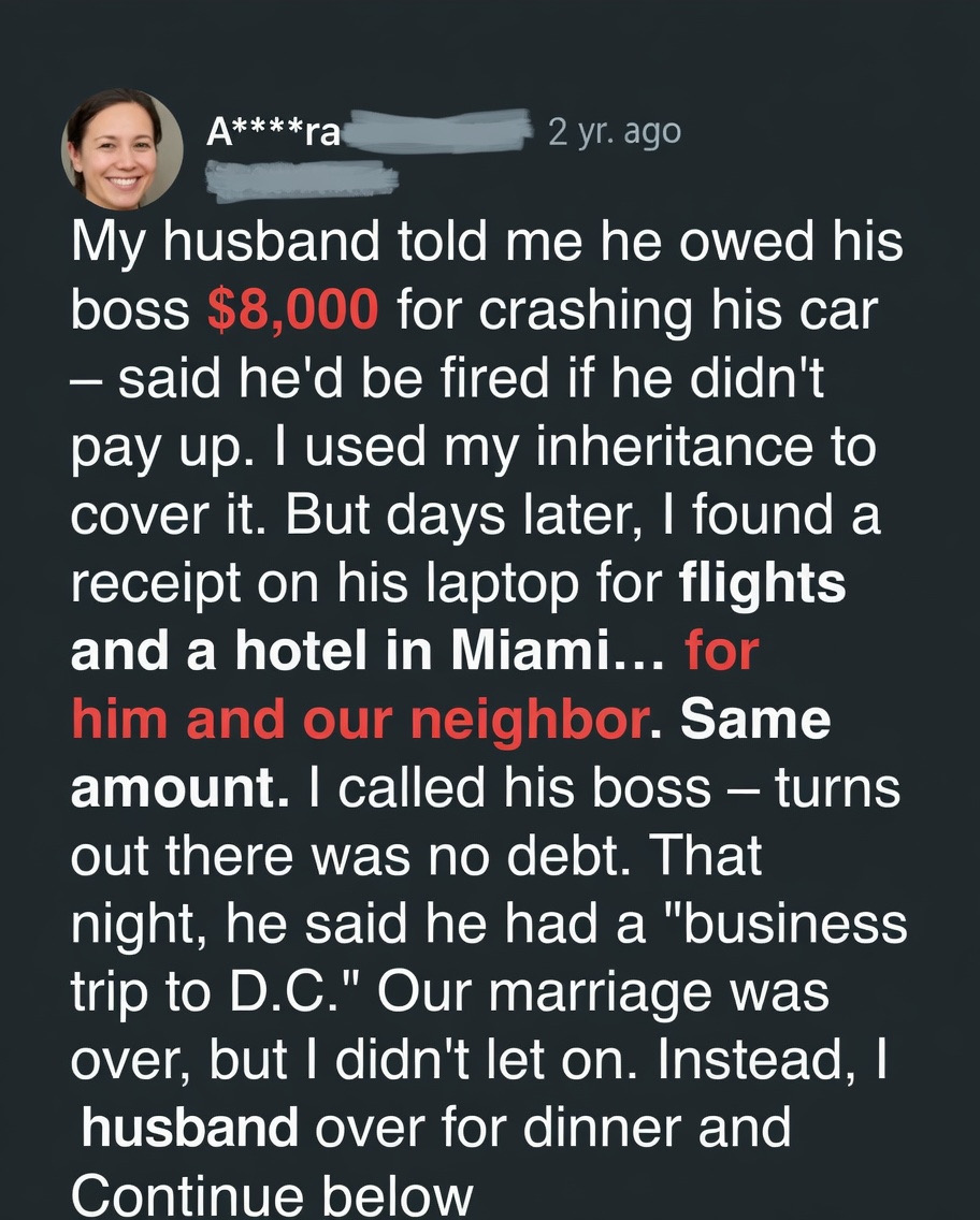 Wanting to protect their stability, she gave him the money without hesitation. But soon, she discovered flight tickets to Miami—booked for Mike and their neighbor, not her. A call to his boss confirmed the truth: there had never been an accident.